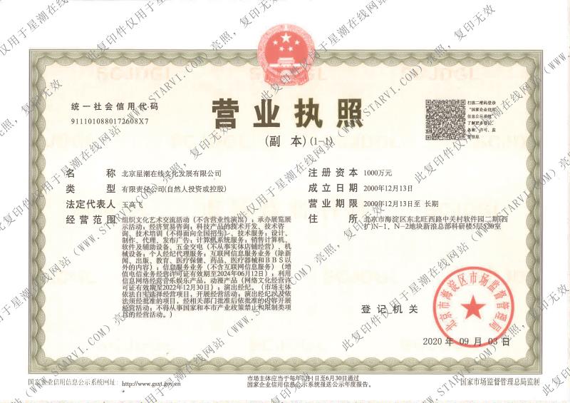 北京星潮在线文化发展有限公司 京网文【2020】0010-001号 京ICP证000105号 增值电信业务经营许可证B2-20090353